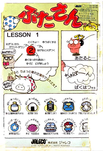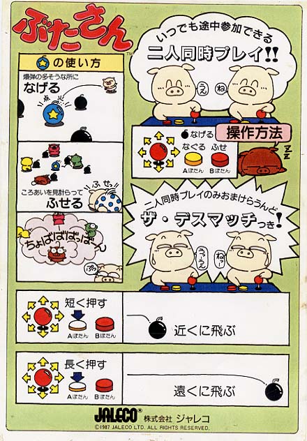爆弾投げバトルロイヤル!(宣伝チラシより引用) 1987年に登場した横画面のアクションゲームです。 8方向レバー2ボタンで水玉模様のパンツを履いたぶたさんを操ります。 操作方法に関してはインストラクションカードがそのまんまなので省略させて頂きます。 スーチーパイドキドキナイトメアのぶたさんゲーム、あれを思い出して頂ければ内容的にはほぼ間違いありません。ただし、爆弾はボタンを押して持つのではなく手ぶらの状態で爆弾に触れば自動的に持ってくれます。 しかし、画面上に現れるブタの数があまりにも多くてコンピューターが互いに爆発しあってくれる場合が多く、意外にクリアー自体は楽です。 ポイントは数々のアイテムでしょう。GUNばれ!ゲーム天国のラジオのぴぐの回想に登場する敵精鋭部隊が装備していた“ごじさんすーつ”と“すりぃぴんがす”もちゃんと登場します。 中でも使えるアイテムが「よじげんりゅっく」。爆弾が4つ多く持てるようになり、なんと爆弾の連射が可能!おそろしいでっせ〜 なお、ちゃちゃちゃんにんぎょうとぶたぱーるにはまだお目にかかっていません。 全16種のぶたさんはそれぞれに特徴を持っていますが、中には爆弾一発では倒せないぶたさんもいます。 中でも恐ろしいのが「みらーぶたさん」。こいつはプレイヤーの真似をします。爆弾投げてもこちらが伏せれば相手も伏せてしまう為爆弾をよけてしまうことが多いのです。その上爆弾が1発当たっただけでは倒せません。(たしか4発)それが1匹ではないのですから… そして全面クリアー後に開始されるのが『ザ・デスマッチ!』。これがはっきり言って一番燃えます。ラストステージクリアー時に2人でプレイしていた場合に開始されるのですが、それこそ一対一の真剣勝負! この時にアイテムは出現しませんが、ラストステージクリアー時に持っていたアイテムはそのまま継承されます。よじげんりゅっくとごじさんすーつを装備していた日にゃぁスッピンのぶたさんでは歯が立ちません。 しかしこのゲームの一番の特徴は『自爆』ですから… ※インストラクションカードの状態があまりにも悪かった為このカードの画像は一部に処理を加えてあります。見にくい部分を見やすくする、消えた部分をわずかに直す等、内容に変更はありません。 |