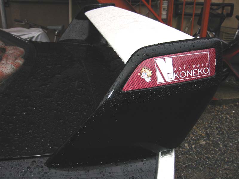 ●取り付けた感想ですが…非常に気に入っております^^ルーフと逆方向、上開きにそびえる巨大なウィングは正面から見てもルーフから横方向に飛び出し異様な存在感を誇りますし、あえて白のままのフラップ部は迎角調整式であることを誇張していて迫力満点です。遠目には小豆色に見える迎角調整部のカバーはレッドカーボン地に白のねこロゴ、運転席側にメカ進藤と助手席側に天使雪希とさりげないながらも非常に強力なワンポイントになっています。 後方部の視界も中央の支えが無くなり…良くなるかと思いましたが迎角最強にしてあるんで微妙です(;´Д`) デルタウィッカーが無くなった事でハイマウントストップランプの問題も解決です。 まぁ、デルタウィッカーを装着していた14個にものぼる穴は…綺麗に直すと数万円コースですのでとりあえず黒のビニールテープ貼っておきましたヽ(´ー`;)ノ