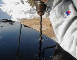 | どぉ〜りるでルンルン くるルンルン♪思い切ってやっちゃいましょ〜 人間諦めが肝心ヨン♪ まずはポンチ打ったところに下穴を。今回はφ3.2のドリルを使用。 いきなり目的の穴で開けても良いけどあんまり回転数の速いドリルで太い穴を一発で開けようとするとミスったときに痛い目にあいます。車的にも、そして本人的にも。 |