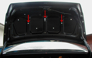 | 右の写真で印した場所がホールソーによる穴です。つまりはverRの設定がある後期形ミラージュでも開いていないものは開いていないって事です。ここに顔を出すボルトもしっかりとナットで締め上げてやればデルタウィッカーとトランクハッチがかなり密着するため水漏れの心配はかなり減ります。(デルタ部分にちゃんとスポンジがついていればの話。 ピンが入る樹脂がはめ込んである穴は家にあった謎のスポンジ状の物体で防水加工しました。出来るならば純正についているあの樹脂をそのまま使う事をお勧め) | |