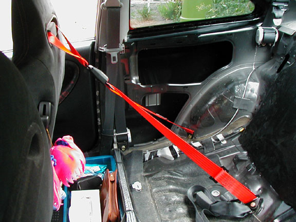 | こんな感じで固定しています。 後部座席のシートベルトを止めているボルトを外してベルト付属のボルトで共締めすれば後ろはOK。これが両肩をホールドします。 ワンタッチで運転席部のベルトとは外れるので後ろの席もちゃんと使えます。 腰を支えるベルト、これは運転席側は付属のアイボルトを運転席用シートベルトの下のボルトと交換すればOKなのですが助手席側は付属のボルトがつくところが有りませんでした。 そこで… |