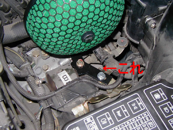 | で、取り付けはかなり苦労しました。 エアクリ固定用のステーがかなり短いような気がするんですけどー(;´Д`) 会社なら5分かからず出来てしまうものですが家には材料がありません。しばらくあがいてみましたが駄目っぽかったのでエアクリ固定しないでステー買ってきました。 写真のような感じで固定するとクリアランス的にも完璧です。 で、折角CJ1A用って言うんだからって事で付属ステーに言いたい事(笑)は ・平鋼と支え部分の溶接ビードは逆側へ出してもらいたい。 ・エアクリ横のタンク(キャニスタータンク?)に接触しないにはステーはエアクリに対して斜めが嬉しい… それが駄目でもせめてステー+45mm(長穴ももう少し長くしなきゃいけなくなるかな) で、ボルトはM6×15では無く×20くらい欲しい… CJ/CK1A/2A汎用だから仕方ないのか? |