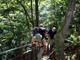 さあ、ロングコースの始まりです。空は快晴。なんだか暑くなりそう。使用前の元気な姿です。高瀬ダムにて。遥か彼方、上の方に烏帽子岳が見えウンザリしてきます。ハッキリ言ってこの日のブナ立尾根の登りが今回のコースの核心で、一度稜線まで上がってしまえばあとは楽勝楽勝!なんて思ってました。が、しかし・・・ さすがに1ヶ月前の夏山最盛期とは違ってだいぶ静かです。逆に元気なオバちゃん達の声が聞こえないと淋しさすら感じます。慣れてしまったんでしょうか、恐ろしいことです。この日のブナ立尾根には数パーティしかいませんでした。 |