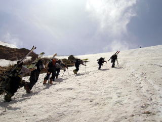 | お昼頃、ようやっと葱平に到着。ここから小雪渓にかけては斜度が増し、雪もやや固く、スリップすると下まで滑落してしまう危険があるので、全員スキーを担いでアイゼンを履き、ロープでお互いアンザイレンして登りました。 |