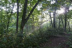 ここからさらに奥地へは自転車も入れないので、ジョギングで体を温めながら進む。場所的に戸隠連山の裏側にあたり、乙妻山、高妻山が朝日に映える。奥裾花自然園に入り、園路は外周を走行。手前側は池が多く観光客用に熊避けのフライパンが設置されているが、訪れる人の少なそうな奥の方にはない。熊鈴を持参しといて良かった。ブナの大木などを眺め、誰にも会わぬままキャンプ場前の水場に戻る。ジョグ距離は8kmほどかな。また水芭蕉の季節にゆっくり歩きたい。