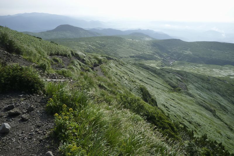 栗駒山にかかる雲が晴れつつあるので、朝5時半、須川温泉からの登山道を歩き始める。湿原からの見晴らし良好。しかし4kmなら30分で行ける、とタカをくくってたら90分かかった。登山競走のノリで計算すると大幅に狂うな。ともかく標高1627mの頂きに到着。南北に中央分水嶺が連なり、岩手・宮城・秋田3県の境界をなすこの山は、まさに奥羽山脈のド真ん中である。下山も別ルートで90分。草露ですっかり靴の中が濡れた。