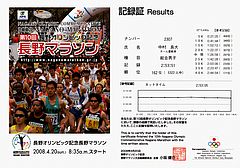 一人一人じわじわと撃墜しながら、でも相変わらずさっきの選手に食らいつかせたままで、何とかプッツンせずに長野オリンピックスタジアム前を左折。ここからスタジアムまでの短い園路が一番辛いのだけど、鈴なりの声援に励まされ、人工芝に入ればこっちのもの。柔らかい地面を味方に付けてラストダッシュ。最後にもう2人抜きに掛かるが、相手も相当の実力者ということか、その後方でのゴールインになった。でも長野マラソン3回目にして初めて両手でガッツポーズ。さらにスリーピースを決めてフィニッシュ。
