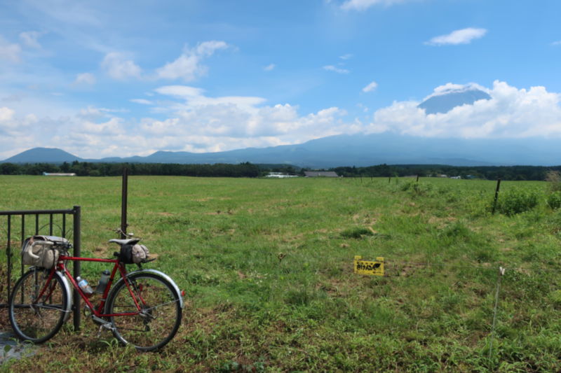今日も標高が上がるにつれ涼しくなると信じて、北へ登坂がんばる。いつしか朝霧高原に入り、富士ミルクランドでソフトクリーム休憩。飲み放題の水場が有り難い。西側からの富士山もさすがの雄大さだが、国道139号に合流すると交通量がぐっと増え、写真を撮るのも一苦労。剣ヶ峰が見えると、富士登山競走の日を思い出す。
