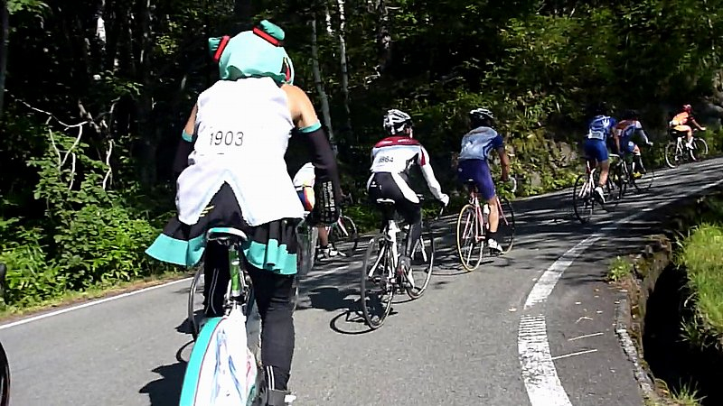 レース中のチャリ載動画は第1CPまでと中途半端で、後半の絶景もなく残念。しかし初音ミクのコスプレを追い回していたので、それをメインに編集したネタ動画として昇華した。