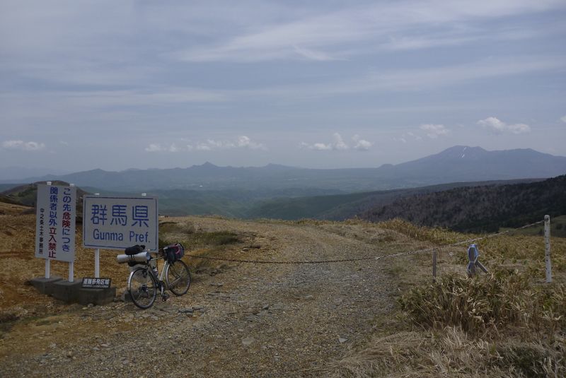 脚のエンジンをかけ直して、目標の12時ギリギリに標高1930mの鞍部まで登り切った。あとは下り基調で、万座への分岐をパスするとさらに細い道となる。樹木の少ない、日本離れした凄い光景。ダートで登ってくる林道や古い索道の跡が近づく。最後はこの道もダート化して、毛無峠に到着した。「未開の地グンマー」ネタで有名な群馬県の大標識で写真を撮り、さあ飯だ。おにぎりなどをガッツリ食らう。ここはラジコン飛行機のメッカにもなっており、実に面白そう。