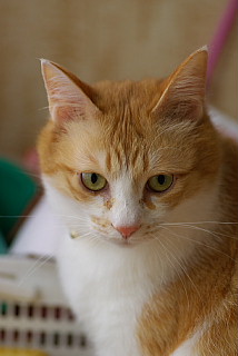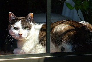 小屋について見ると、網戸はすでに閉められていました。 あまり早くにしめてしまっても暑さがこもるので、一応 ガラス窓を開けて中をのぞいて見ましたが、いつもなら 私の姿を見てかけよってくるにゃんずが1匹もいません。 小屋の中は夕方で薄暗かったので、みんなどこにいるのかと 目を凝らしてみると、みんなそれぞれ自分のベッドに 入って、くつろいでいました。