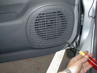 フロントスピーカのグリルを外す。 下前方に、小さな穴があるので、 マイナスドライバーを差して、こじ ると簡単に開きます。 |