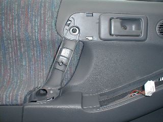| パワーウインドウのパネルを 外します。前方側を手前に持ち 上げると、簡単に取れます。 |