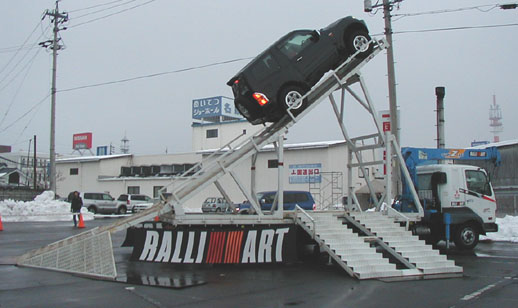 そのあとパジェロの体験試乗ということで45度の坂上ったり横に25度傾いてみたりと楽しい体験をしました。上に45度は乗っている人間にしてみれば垂直ですよ。空しか見えないし。運転している三菱の人は片手をステアリングから離して解説しているし。すいません、鉄の網の上走っていますが雪降ってるんですが。