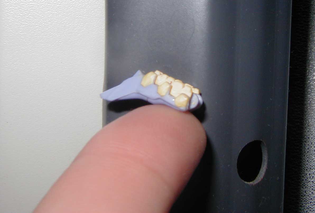 で、筆を洗う時に塗料皿を探していたら←こんなものが出て来ました。判りにくいかもしれませんがEVAの頭の作りかけです。その上暴走しています。小さすぎて写真には到底写せないのですが、目はクリアーグリーンの下にアルミテープを貼っていて光って見えます。ご丁寧にケガキ針で網膜まで刻み込んである一品です。間に見える黄色い三角の物体は歯と歯茎です。入れ歯みたいなものですね。口の中はご丁寧に舌まで再現してあります。モールドの彫りなおしはまだ終わっていない状態ですが顎部ジョイントの再成型は行っていますね…顎の拡大写真はこちらです。支えているのがワシの人差し指です。よくやったもんだ…