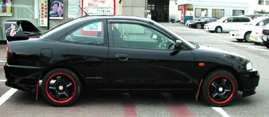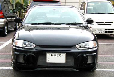 | 肝心のバンパーが見えにくいです。 あまり詳しくない人なら「ミラージュ‐エボリューション?」「エボWクーペ?」とか思いそうです。 いくらバンパーが変ってもやっぱりミラージュですね^^ワシはこの猫科系のヘッドライトが好きなので全然問題ありません。 一時は顔面スワップ(EVOW移植)も考えたんですがね… |