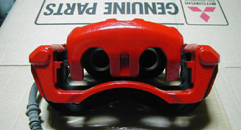 | 作業はキャリパーを外して行なうのが一番綺麗に仕上がります。 まずはベースカラーを塗ります。塗料はキャリパー用塗料の使用を強くお勧めします。普通の塗料も実は過激なスポーツ走行しなければ焼けて変色したりせずに耐えてくれるものですが…意外な落とし穴があります^^; この時点でロゴを入れる部分は全てグラインダーで凹凸を削り落としやすりをかけて平らにしてあります。純正のパーティングライン程度は削っても本体に影響はありません。 多分メーカーロゴがある場合でも削って問題無いと思います。エボへのスカイライン用4ポット流用でも可能な技だと思いますので試してみてはいかがでせうか? |