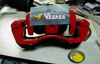 | 塗装に入ります。この時点でも使用する塗料は必ずキャリパー塗料を使用してください。私はこの部分の塗装は白のキャリパー塗料が見つからなかった事と、塗る面積とコストを考えて耐熱・耐候塗料を使用しました。しかしこれは大きな失敗でした。 塗るときは可能ならばスプレー式のものを推奨します。筆塗りはコツがありまして、場合によっては非常にシビアなものになってしまうからです。簡単に言えば大抵の場合は後から塗った塗料がベース色の塗料を溶かしてしまい、色が混ざってしまうのです。 焦らず急がず、薄く塗って乾くのを待つ…辛抱強く作業を行なう事が重要です。 塗料が換装してきたら完全乾燥前にマスキングテープを剥がすのが理想です。が、これに関しては経験がものを言いまして、あまりお勧めは出来ません。成功すれば最高ですが失敗すると悲しい事になります。 |