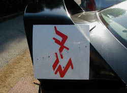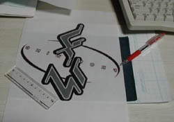 | まずは自分の車の色を考えながら目的の形をイメージします。 今回は某ロゴですが黒い車に黒は目立たないので白に変換し、ついでに線の数を減らします。 はっきり言ってここでの線の減らし方、色の選び方が一番大切です。 自分の出来る範囲で。細かくしすぎても上手く行きませんよ。 |