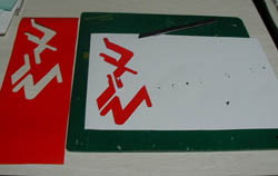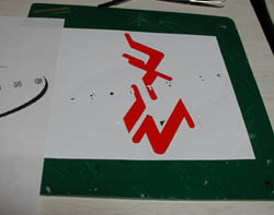 | 慎重に切り終わった赤い部分をベースとなる白の上に乗せます。慎重にね。位置が決まったらしっかりと貼りつけます。(紙を乗せて圧かけてこすりまくりましょう) |