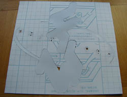 | 本当は転写シートに一度移すのが良いんだろうけど今回はあまり細かくないのでパス。カッターで切込みを入れても結構もとの状態を保っているのを利用してそれぞれを切り離さずに裏の紙を剥離します…本体からシートが外れぬよう、これも慎重に… |