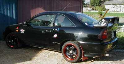 | 貼ります!根性決めて。中性洗剤等でしっかりとワックスを落としておかないと後で泣きを見るよ〜(体験者談) 薄めた中性洗剤で表面をぬらしておくと位置決めが楽です。(くっつけてからも動く。そのかわり動いてもしまう)今回は乾燥状態で貼りつけています。しっかりと相手(今回はウィングに)定着させてからこれまた慎重に余白部分を剥がすと… |