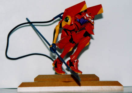 完成品第2段はエヴァ02です。 今回の目標は「猫背の再現」です。 胴体を全て輪切りにして猫背を再現しております。 前回に比べて各段に改造個所が増えています。 手を加えてないのは顔だけですね。 ソニック・グレイブはガレキに付属していたものを使っていますが、 既にメーカーどこだったか忘れました。 そのため右手は完全に自作です。 ちょっとポーズが堅いですね。 戻るのだぁ〜